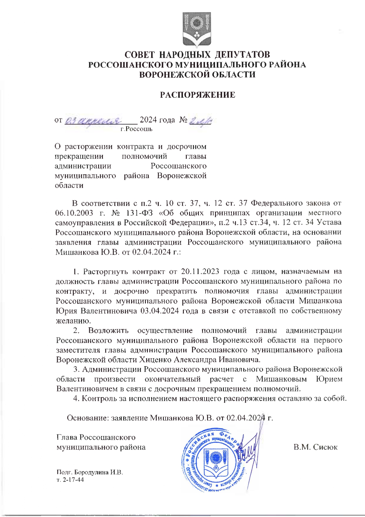 О расторжении контракта и досрочном прекращении полномочий главы администрации Россошанского муниципального района